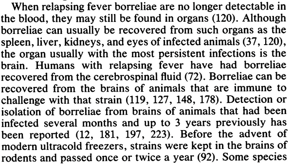 All the way back in 1986 it is not trivial that Borrelia have an affinity for brains. It is also not trivial that you cannot kill spirochetes, and that the nature of the disease as a Relapsing Fever germ is in fact, to relapse. This paper also states that it was attempted to treat syphilis with a wimpy high passage strain of Borrelia to cause fever because antibiotics didn’t work.